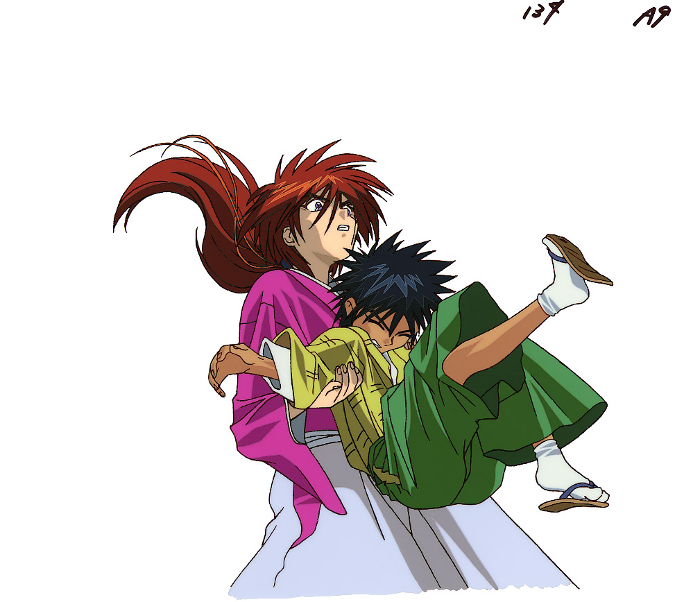 From the Eastern Western episode where the gang rides the train to Yokohama and interrupts a robbery. The bad guy has just thrown Yahiko at Kenshin. The characters look very different in this episode, much more spiky and angular than in other episodes. In fact the stylized art in this episode makes it one of my favorites, I was glad to get cel from it. |