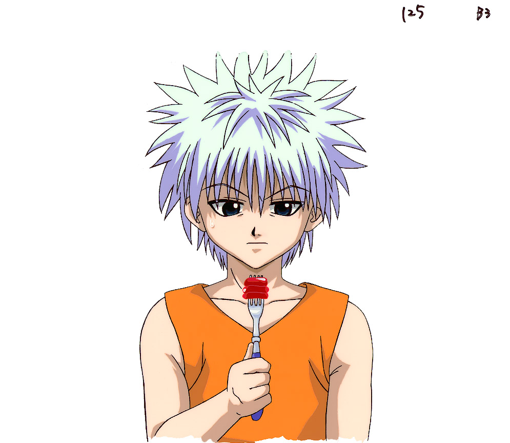 During my brief stint at RPI in the singularly unappetizing town of Troy, NY, the food service was provided by a sinister conglomerate that lurked behind the acronym DAKA. In this cel Killua has the same expression as every diner in the student cafeteria. He's asking himself, "what is it, and am I hungry enough enough to eat it?" |