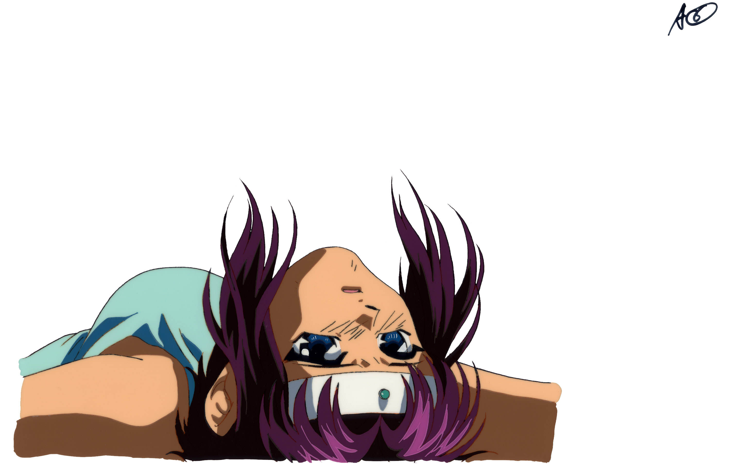 This is sort of a strange cel. First of all, it's big -- take a look at the uncropped view. Secondly, I'm almost positive she's lying down on the floor of the arena but her hair is pointing upwards. Hmm...