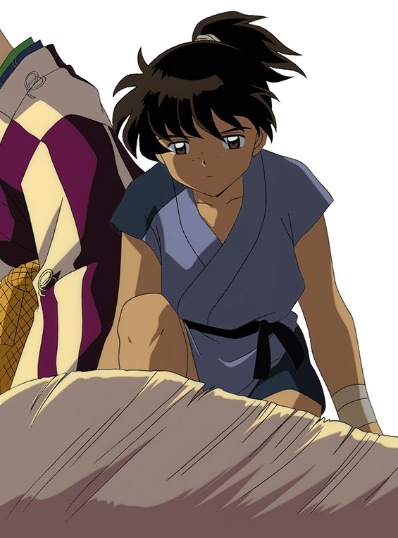 Huge pan cel of Kohaku riding Kagura's feather. From the way his eyes are drawn he's no longer under Naraku's control. I think this is from one of my favorite Kohaku scenes, when he recovers his memories and throws himself off the feather.